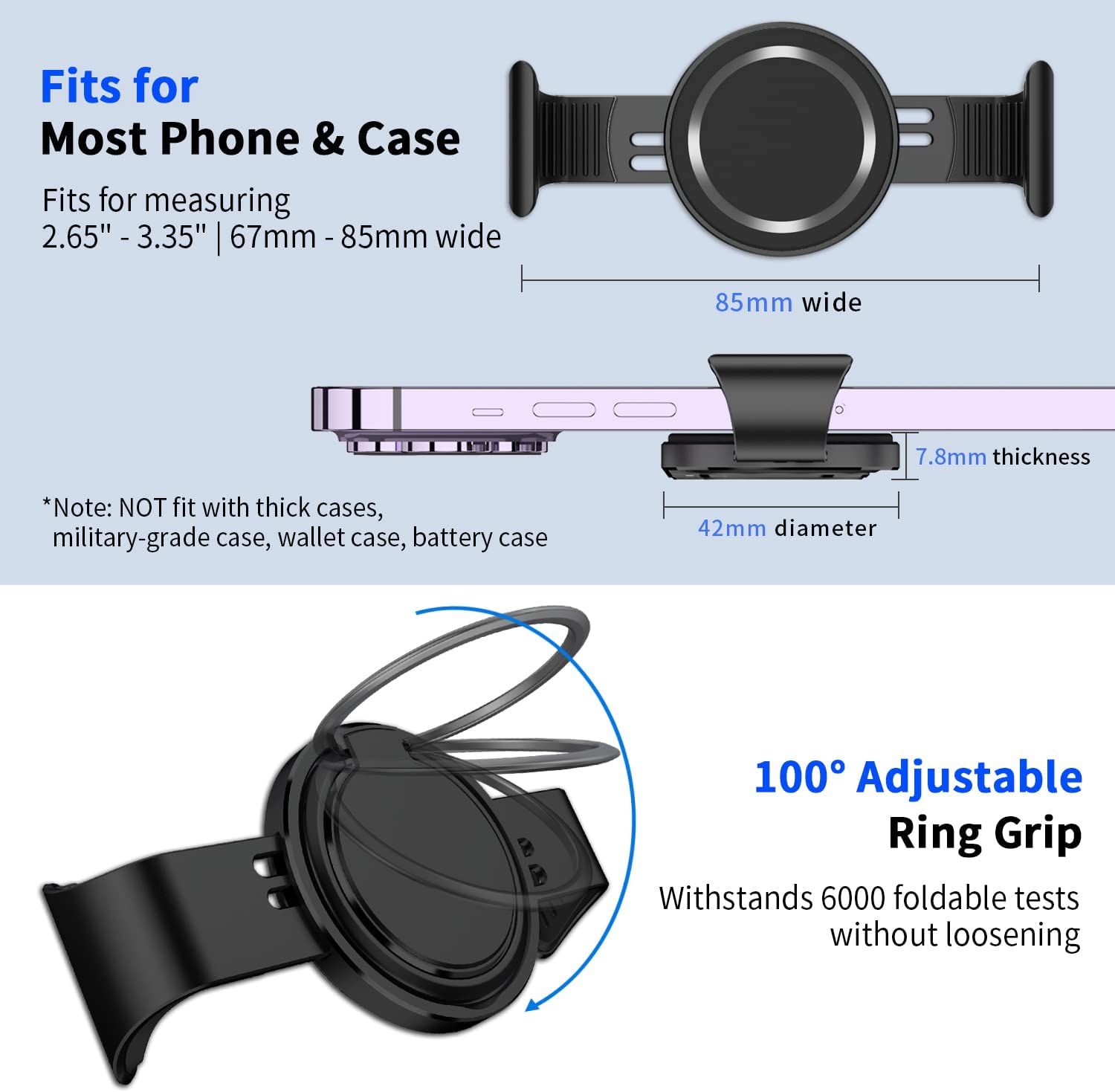 EASY CLIP & REMOVE - Unlimited reuse and anyone can use it. Fit for most any smartphones or phone cases measuring 2.65" - 3.35" | 67mm - 85mm wide. Easy to clamp and remove at anytime, does not affect wireless charging to more convenient.
