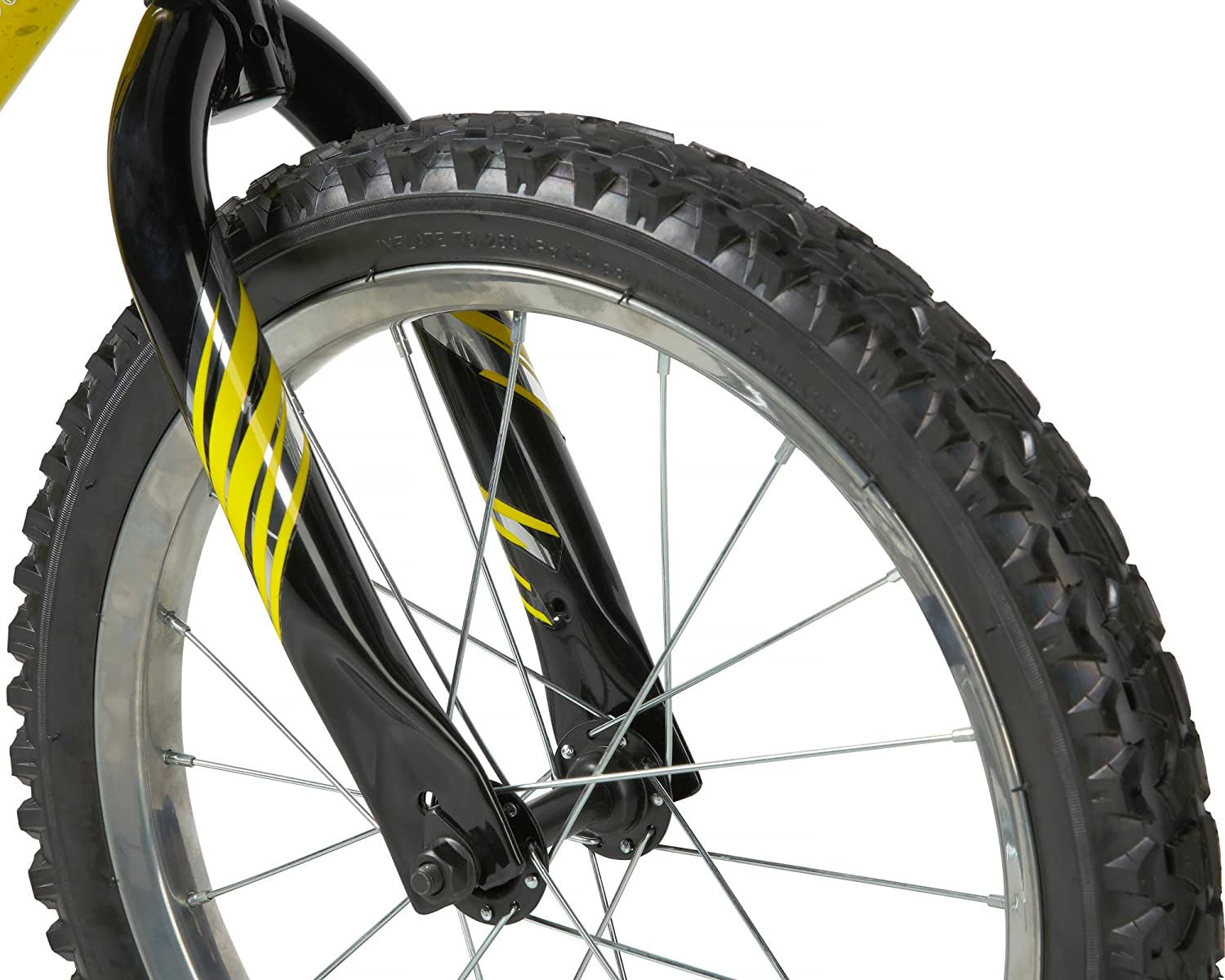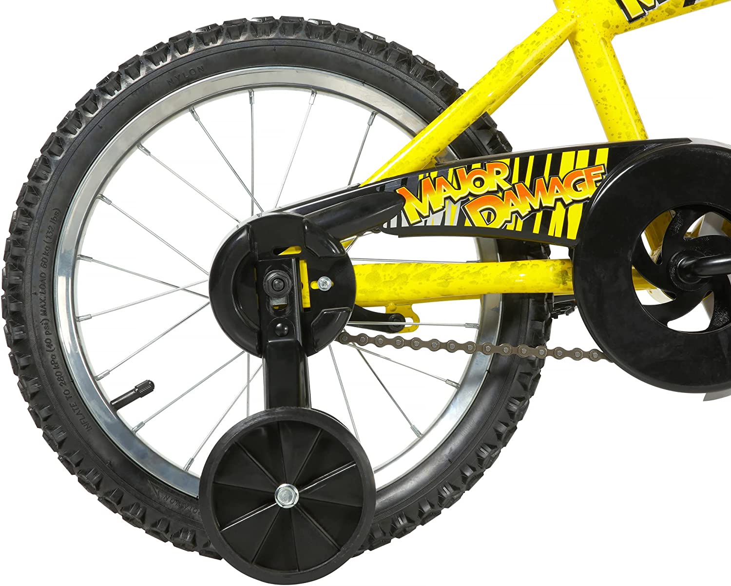 Be awesome, be epic, and cause some major damage! You’re sure to accomplish all three when you ride the Magna Major Damage 12-inch Boys Bike by Dynacraft. This BMX-style frame features a bright blue and black deluxe paint finish, along with eye-catching custom graphics and colorful details on the handlebar pad, frame, and chain guard. Coaster brakes make stopping especially easy and removable/adjustable training wheels provide an extra level of stability until they’re ready to cruise on their own. An adjustable, padded seat also allows the bike to grow with them. The size and design of the bike are great for riders ages 3-5 years. Give your young one an epic ride on the Dynacraft Major Damage 12-inch Boys Bike.