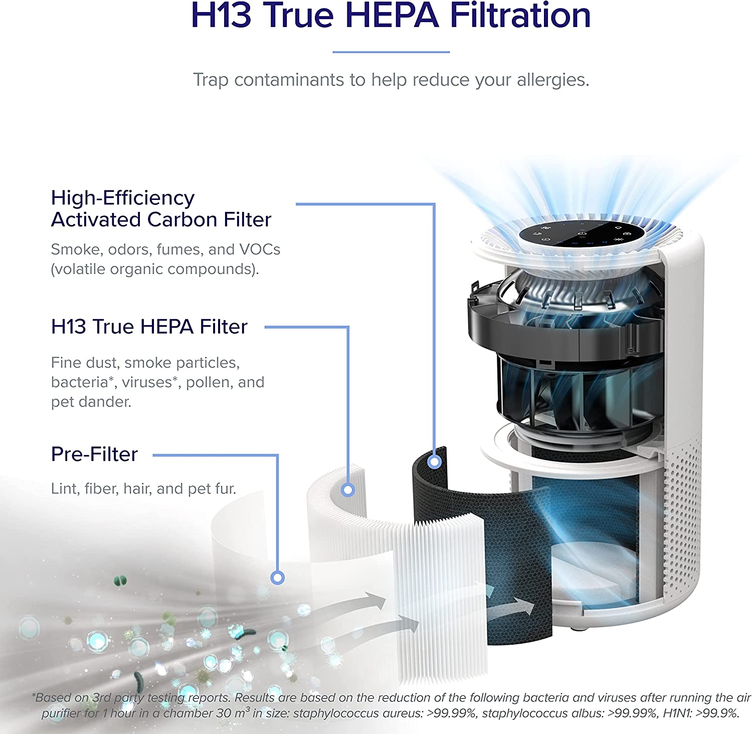 - IMPROVED FILTRATION: While the ultra-fine Nylon Pre-Filter and High-Efficiency Activated Carbon Filter capture large particles and absorb odors and fumes, the H13 True HEPA Filter captures 99.97% of airborne contaminants 0.3 microns in size, ridding your environment of dust, pollen, pet dander, mold spores, and more