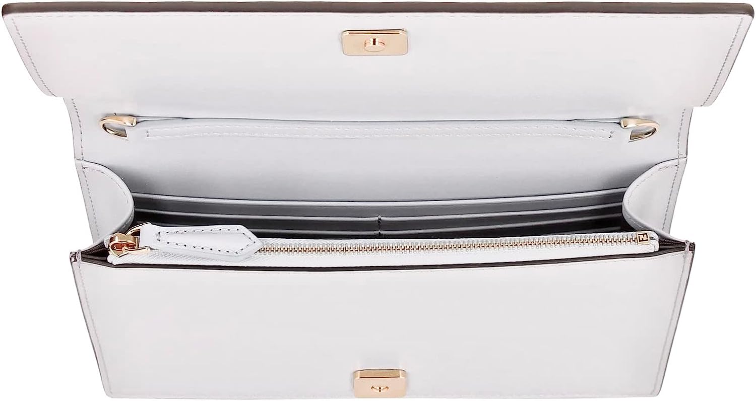 The Fendi Roma Ghiaia Wallet on Chain is beautiful and luxurious. The off-white soft leather is enhanced by the bold Fendi logo across the front. Carry by hand or over the shoulder by a delicate gold chain. Flap opening reveals a main compartment with credit card slots and a zippered pouch. Items stay secure with a snap closure. A beautiful white handbag perfect for everyday, weddings, an evening out and more. This timeless piece will bring joy for years to come.